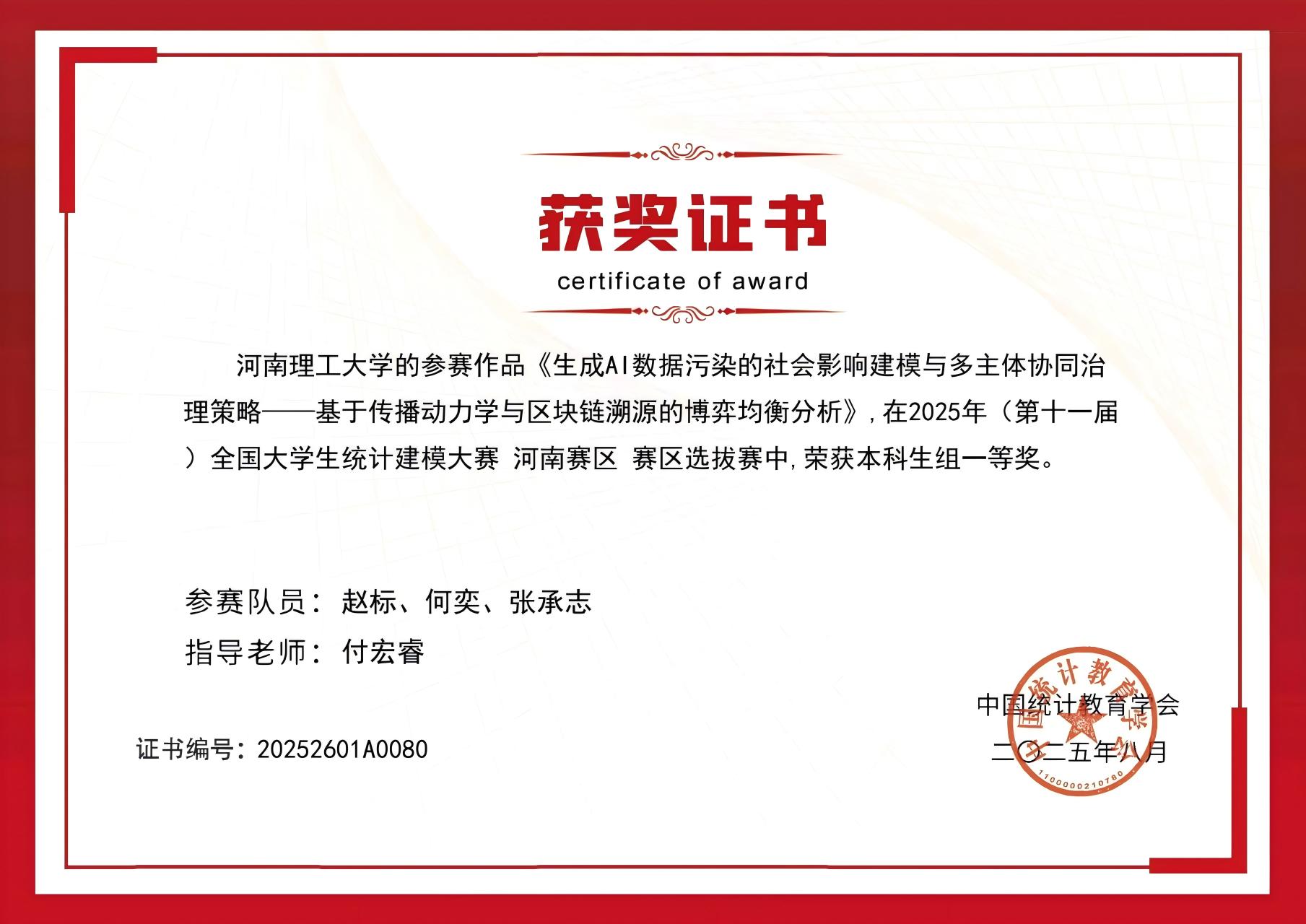 近日,2025年(第十一届)全国大学生统计建模大赛获奖名单公布。我们参赛队经过奋勇拼搏,荣获河南赛区一等奖1项。